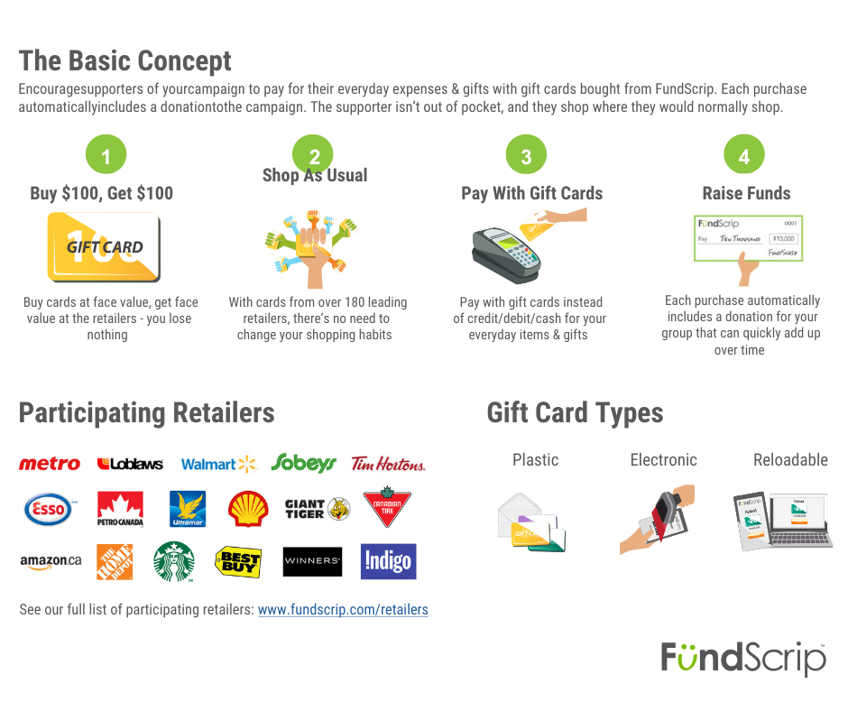 Choose gift cards from some of Canada’s largest and most popular retailers! Cards are sold at face value & Happy’s Place earns rebates ranging from 2%–10% of the purchase price of the cards.